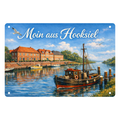Dieses Blechschild zeigt den historischen Hafen von Hooksiel mit Fischerbooten und dem Schriftzug „Moin aus Hooksiel“.