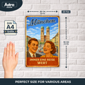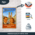 Dieses Blechschild zeigt ein nostalgisches München-Motiv mit Blick auf die Frauenkirche und den Schriftzug „Immer eine Reise wert“.